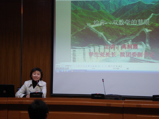 10月30晚,2008――2009学年度第一学期“科学、人文、艺术素质教育系列讲座”继续进行,院学生处处长、团委副书记高润霞作“给你一双数学的慧眼”专题讲座。