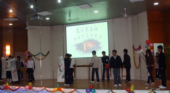 1214晚,在图文信息中心一楼大报告厅,院逸风书法社举办了两周年的庆典晚会。学生处处长高润霞、副处长许迪楼、逸风书法社指导老师吴跃国、机电系团总支负责人姚咏、团委王晓林老师应邀观看了晚会。