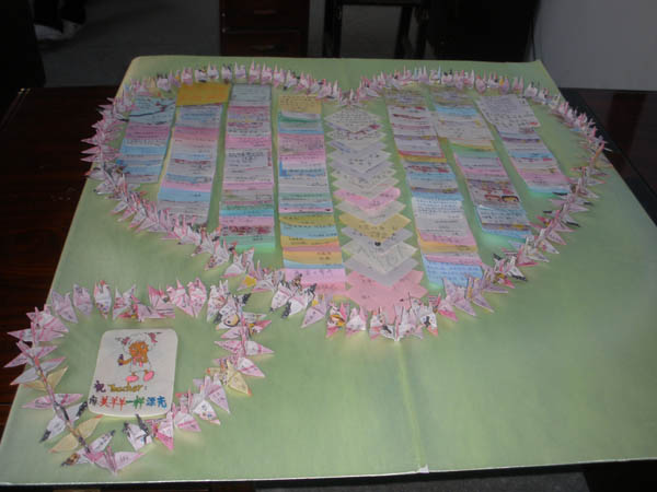 在该系学生会女生部的积极组织下,同学们用彩纸为女老师剪折了千纸鹤、制作成“心”型并写上祝福言语,于3月8日早上,给女老师送去温暖的祝福,老师们非常感动。