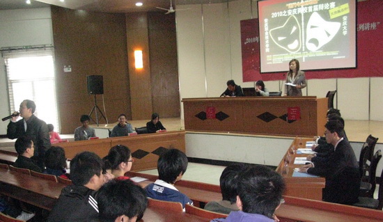 2010年4月10日下午两点两校友谊辩论赛总决赛在我院图文信息中心一楼报告厅举行,两校各派出一支精英队伍参加辩论。院团委余锋老师、王晓林老师、心理咨询室何世亮老师以评委身份出席了此场比赛,比赛期间辩论激烈精彩却不失友谊,特别是自由攻辩阶段,双方攻守激烈,赢得场下观众阵阵掌声与好评。辩论结束后评委老师给予了双方精彩的点评,最终我院代表队获得冠军,安师院代表队二辩吕良同学获得“最佳辩手”称号。辩论结束后双方辩手互相交流经验并与评委老师们合影留念,同学们都表示两校学生团体的交流与合作将会一如既往的进行下去,两校友谊长存。