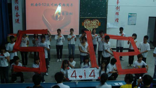 晚会结束,同学们亲手拼成了512414的图形,这让晚会又增加了一层浓浓的悲情氛围。“汶川不倒、玉树不哭”,我们有理由相信,只要你们不放弃,我们也不会放弃,我们伟大的中华民族更不会放弃!同胞们,加油!