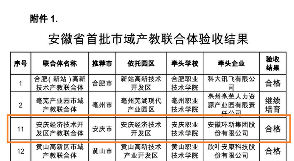 近日,安徽省教育厅发布公示,以安庆经开区为依托,以我校为牵头学校,安徽环新集团为牵头企业组建的安庆经济技术开发区产教联合体,作为安徽省首批省级市域产教联合体建设项目,顺利通过省教育厅考核验收。安徽省首批省级市域产教联合体建设项目立项12家,验收通过9家。以我校为牵头单位组建的安庆高新技术产业开发区产教联合体,获批为安徽省第二批省级市域产教联合体立项建设项目。