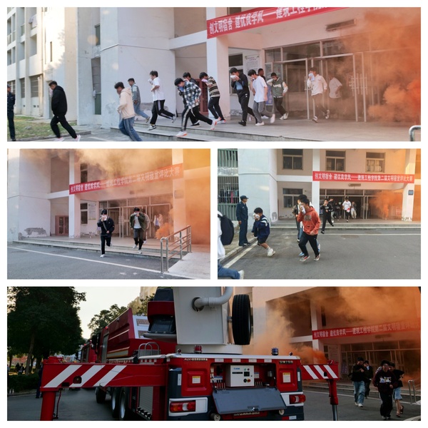 组织六号学生宿舍楼三、四楼层200多名学生模拟火灾发生时的紧急疏散演练,同学们打湿毛巾、捂住口鼻、低头弯腰、不惊慌、推挤、无踩踏、选择最安全的疏散路线逃生。室外场景:模拟三楼某宿舍失火,消防员利用消防车升降设备高压水枪进行高楼作业,现场灭火,让同学们零距离感受消防、体验消防和了解消防。