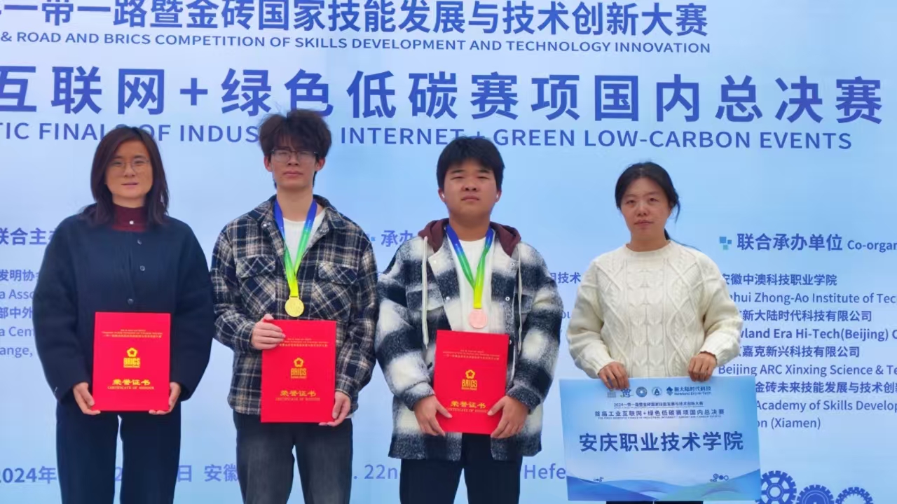 11月24日,经过两天的激烈角逐,2024“一带一路”暨金砖国家技能发展与技术创新大赛首届工业互联网+绿色低碳赛项国内决赛在合肥市安徽中澳职业技术学院落下帷幕。我校机电工程学院工业机器人技术专业的学子们不负众望,凭借出色的专业技能和创新精神,分别荣获了该赛项的一等奖和三等奖,指导教师夏燕玲获得优秀指导教师荣誉称号,学校获得最佳组织奖。这是我校今年在该类赛事上第二次荣获金奖。