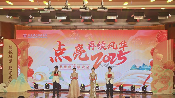 12月30日晚,我校“再续风华 点亮2025”元旦师生联欢在校图文一楼报告厅精彩上演。校党委副书记、校长毕明生,党委副书记李克让,党委委员谭维奇、程飞、陈继平、高润霞、吴何珍、李五一出席,各二级学院、职能处室主要负责同志和师生代表600余人现场观看了晚会,团市委书记项薇、安徽黄梅戏艺术职业学院师生代表,受邀观看晚会。晚会全程进行线上现场直播,超万余名观众在云端共赏我校岁末文艺盛宴。