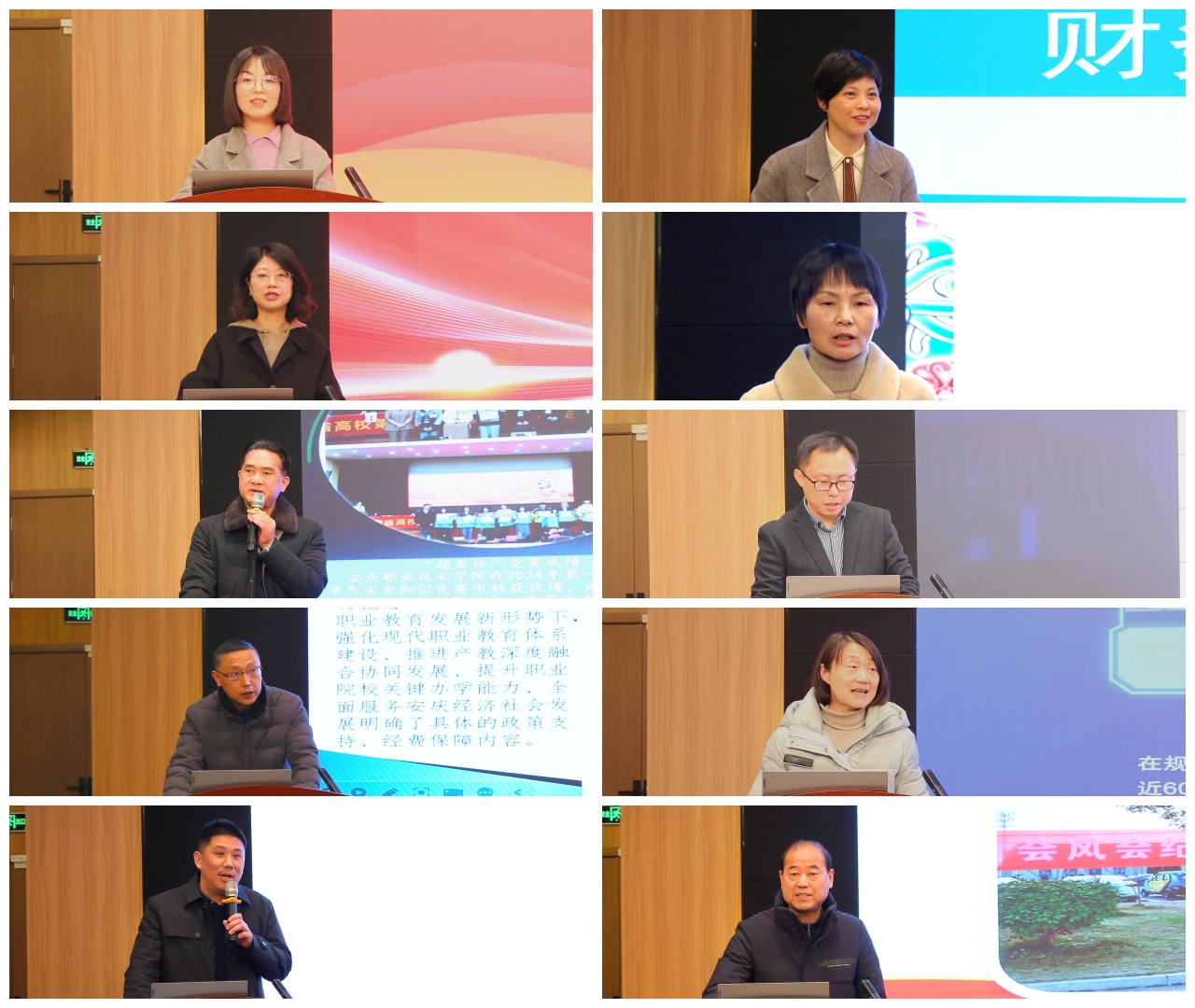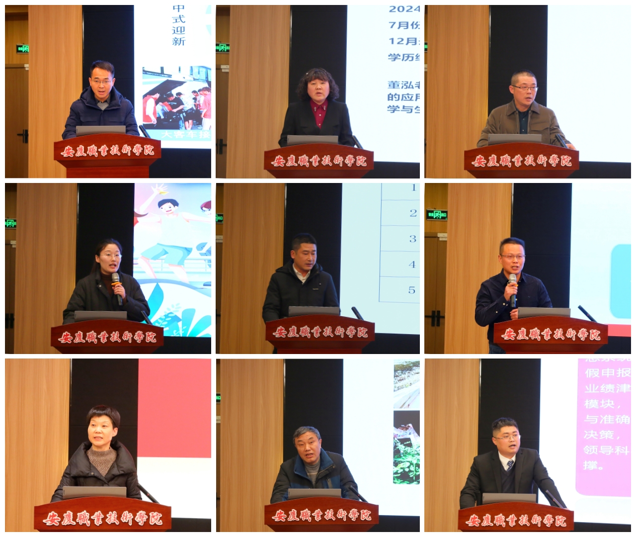 毕明生在总结讲话时代表学校向各单位师生员工的辛勤付出表示感谢和敬意!他指出,2024年让我们感到最自信的是,全校上下精诚团结,心往一处想、劲往一处使,逢山开路、遇水搭桥,迎接了一个又一个挑战、攻克了一道又一道难关。我校以高度政治自觉配合省委第二十三巡视组,出色地完成了巡视任务。编制“周转池”计划落地见效,体育馆资金缺口得到及时弥补,深化集团化办学得到政府的继续支持。让我们感到最欣慰的是,我们始终坚持以立德树人为根本,牢记并践行学生成长需要就是我们努力方向,一切为了学生、为了学生一切。领导与你“面对面”“夜话”等系列活动风生水起;“一院一品”校园文化节有声有色;体育赛事更是捷报频传,继舞龙舞狮、龙舟赛等特色项目后,在女子足球、男子篮球等大类赛项上有质的飞跃。让我们感到最自豪的是,我们在职业院校的主流赛道上继续斩金夺银,频频笑傲江湖。移动应用技术设计与开发赛项,让我们站到了世界职业技能大赛的巅峰;国际大学生创新创业大赛,我们综合成绩在全省遥遥领先;教师教学能力大赛再获一等奖、思政课教学展示荣获特等奖。由于我们在服务地方发展上的突出贡献,学校入围《中国高职院校质量年报》中部地区“服务贡献50强”。一年来,我们看到了师表的风范。以汪扬、查艳、何世亮、冯鲁红、沈璐等为代表的一大批一线教师,深耕课堂、深爱学生,默默付出、无私奉献,用仁爱之心和躬耕态度,再一次展示什么叫“为人师表”!一年来,我们看到了改革的希望。农技推广人才的定向培养试点,让我们的高考录取分数线破天荒超过了“一本线”;市域产教联合体的单独招生、农民培训学分银行试点、“一试三证”探索等等,让我们在办真职教的道路上,走得坚定而执着!一年来,我们看到了坚守的力量。我们的学生工作队伍,时刻紧绷安全稳定之弦,时刻紧盯安全风险隐患,时刻冲在安全维护前沿,守牢了校园安全底线,师生平安健康,校园和谐稳定。