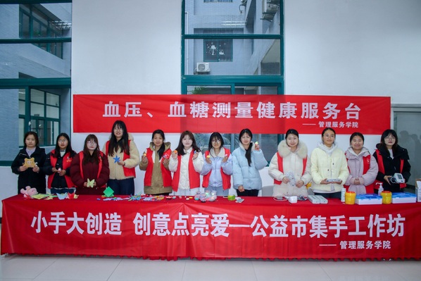 管理服务学院 “小手大创造 创意点亮爱” 项目洋溢着童趣与关怀。项目不仅设立了公益市集手工作坊,还设置了血压、血糖测量健康服务台。活动现场,志愿者们为前来的师生们认真细致地测量血压、血糖,热情周到地解答相关身体健康问题,对如何健康快乐地生活给出了许多科学温馨的建议。