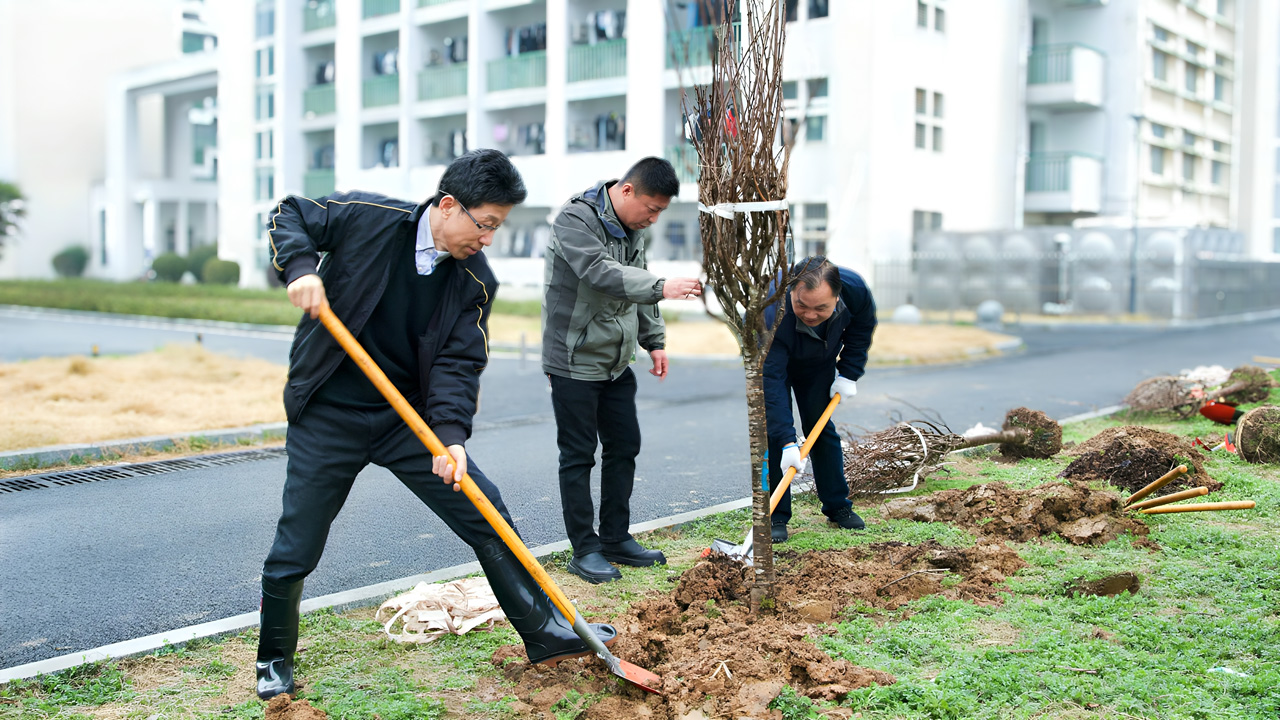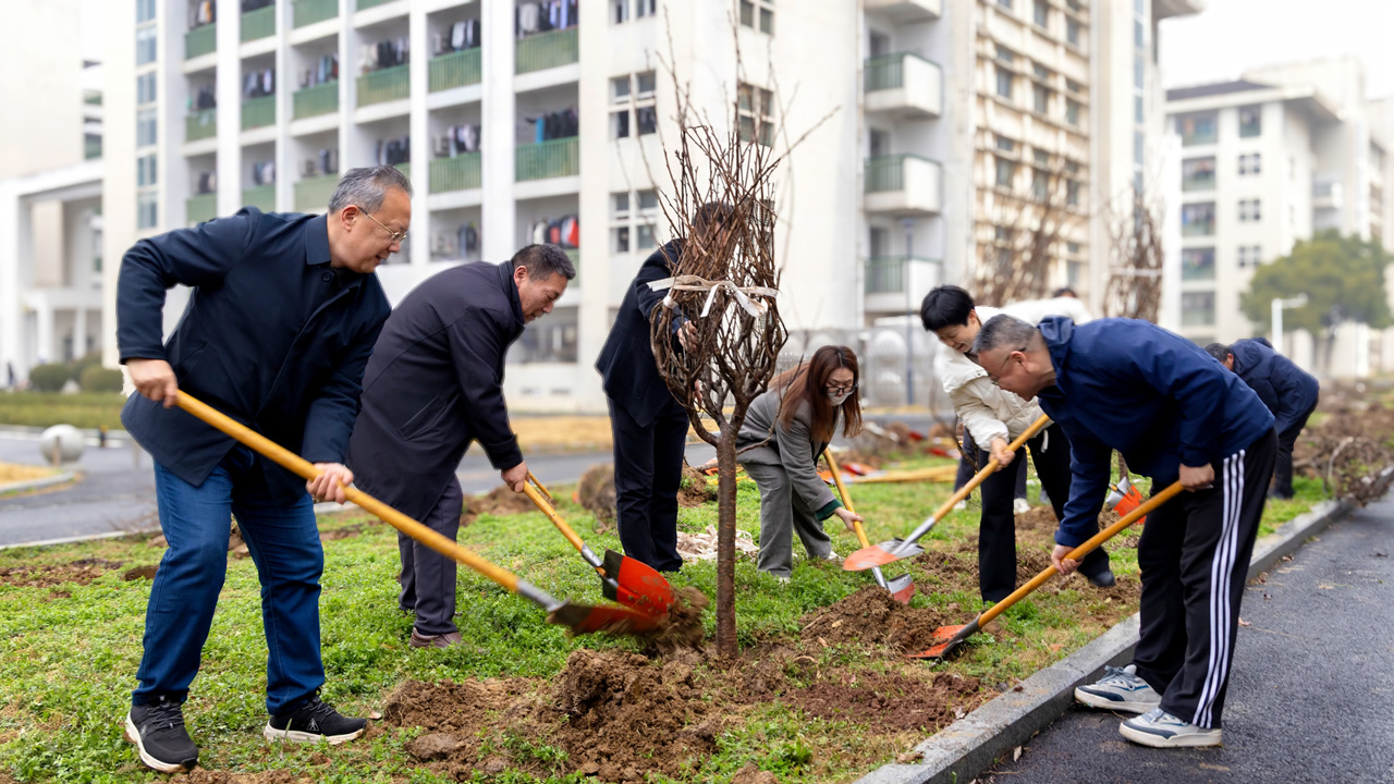 在第47个中国植树节来临之际,3月12日上午,校领导毕明生、李克让、谭维奇、程飞、陈继平、高润霞、吴何珍、李五一,教职工代表、学生志愿者200余人在学生公寓1-4号楼东侧举行“绿满校园,共建生态职院”主题植树志愿活动,用行动诠释对绿色的热爱。