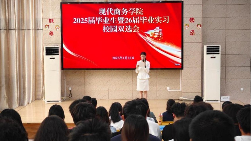 4月16日下午,现代商务学院举办2025届毕业生校园双选会。学院党总支书记金启胜、招生就业处负责人及800余名师生参加活动。