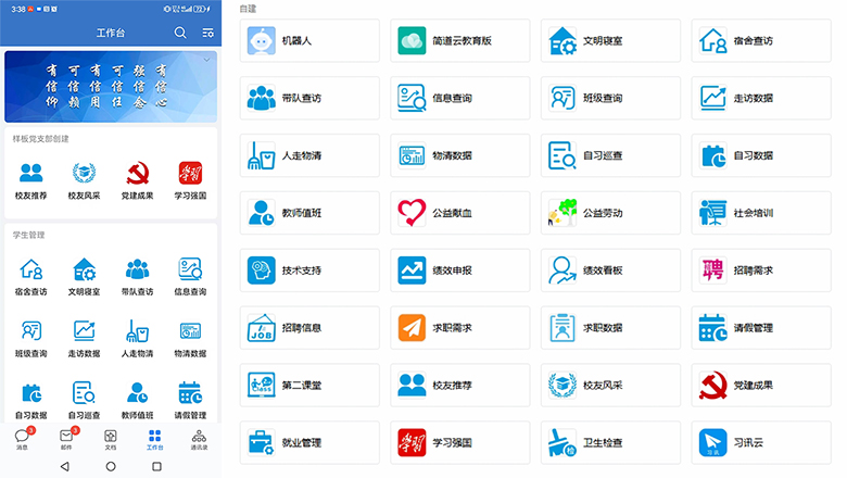 陈富汉以“身边的AI智能体”“企业微信常用功能应用”以及“学院自建AI智能体”三种类型的应用软件,现场演示了操作流程,展示了企业微信智能表格在数据收集、处理与可视化分析中的高效应用,显著提升了辅导员事务处理效率。他表示,该院自主研发的两个AI智能体——“学伴”,该智能体分别接入了DeepSeek-R1和Hunyuan大模型,训练了丰富的学生管理知识库,能做到随时响应,成为辅导员日常工作的得力助手。同时,他还介绍了该院自主搭建的“六信工作台”,持续集成和开发了40多个应用,涵盖人走物清、请假管理、宿舍管理、安全管理、招聘就业等多个场景,覆盖了学生日常管理各环节,有效实现了学生管理工作网格化、精细化和智能化。