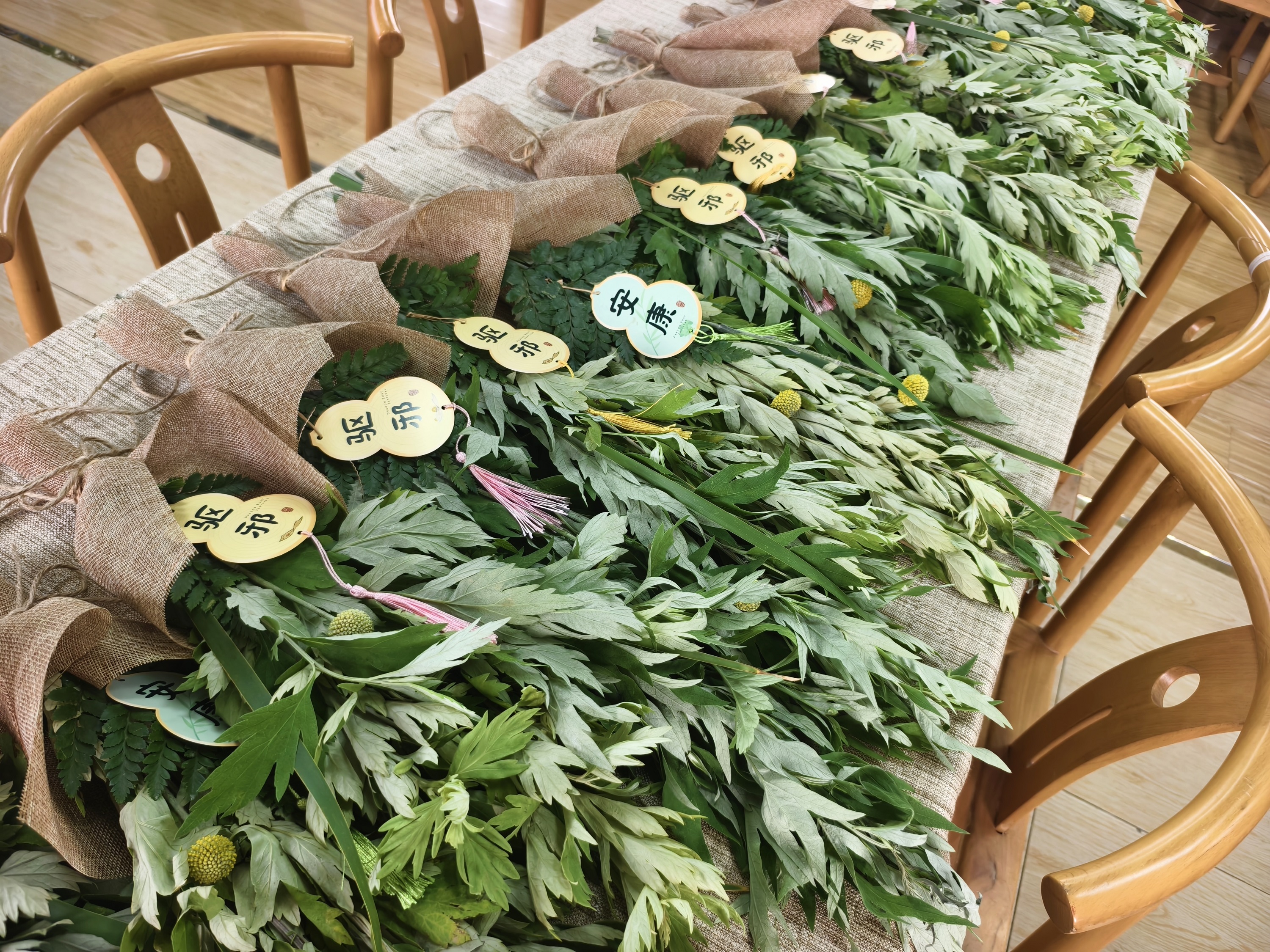 艾草花束则是当下市场的新宠,师生将新鲜艾草搭配青翠菖蒲、明亮黄金球,以葫芦等卡片作点缀,然后用麻绳捆扎出带有流苏装饰的创意花束。它的制作既保留驱邪纳吉的民俗意蕴,也体现了现代年轻人的审美,这株承载着东方智慧的艾草,在师生的手里绽放新的生命力。