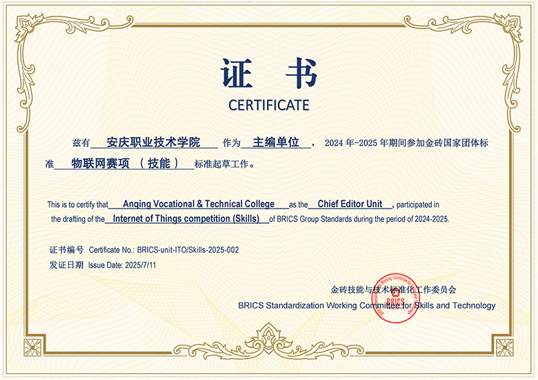 近日,金砖国家技能与技术标准化工作委员会正式颁发证书,确认我校作为主编单位(证书编号:BRICS-unit-ITO/Skills-2025-002),参与2024–2025年度金砖国家团体标准《物联网赛项(技能)标准》的起草工作。