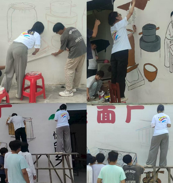 8月28日至30日,在平岭村忆留乡手工挂面加工厂内,一幅32平方米的彩色墙绘正悄然成型。建筑工程学院“青春画笔,点亮乡途”实践团的青年学子们,以汗水为墨、专业为笔,将传统手工挂面的制作流程描绘下来,用艺术实践书写乡村振兴的青春答卷。