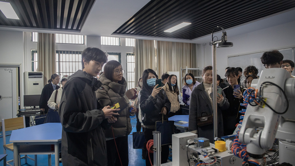典礼结束后,安徽省终身教育学分银行管理中心工作人员进行了学分银行系统操作演示,详细展示了学分录入、积累和转换的流程,方便学员了解学分银行的运行机制。随后全体参会人员参观校园实训室。在汽车实训室,工作人员结合发动机拆解模型等,介绍设备如何辅助教学;机器人实训室里,机械臂、服务机器人现场演示,展现多元应用场景;数控实训室陈列的复杂零件、精巧模具等学生优秀作品,彰显学院实践教学实力。