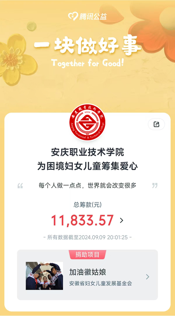 2024年久久公益节,在学校党委的高度重视和大力指导下,各二级单位广泛动员积极行动,全校师生员工倾情参与,学校公益事业再谱新篇。截止至9月9日20点,共募集基金11833.57元,其中爱心师生捐赠9621.41元,腾讯基金会配捐2212.16元。活动参与人次、募集金额均创历史新高。本次筹集的爱心基金将全部用于资助我校困难师生。