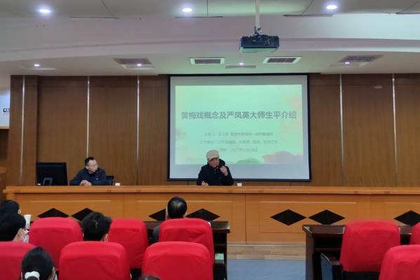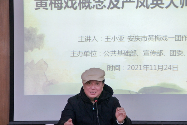 11月24日下午,由我校公共基础部、宣传部、团委、校体艺委联合主办的专家进校园“美育”系列专题第二场讲座在图文信息中心三楼报告厅举行。本次邀请到了安庆市黄梅戏一团作曲指挥、黄梅戏大师严凤英之子王小亚做题为《黄梅戏概述及严凤英大师生平介绍》的讲座。出席本次活动的老师有公共基础部党总支书记张林主任,校办公室李三平副主任以及艺术教研室和对艺术感兴趣的老师们,管理服务学院、建筑工程学院200名学生代表到场聆听,全校师生通过云犀网上直播观看,讲座由音乐课程负责人梅文斌老师主持。