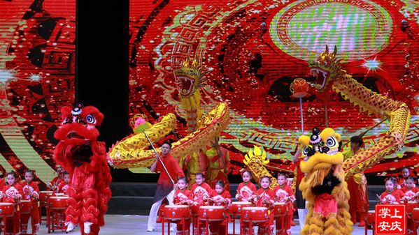 本次联欢会由安庆市教育体育局和安庆市新闻传媒中心联办,以“春满桃园”为主题,共分为“龙腾盛世春满园”“牢记嘱托再出发”“赓续传承更有戏”“舞韵婀娜赞四季”“阳光活力展风采”“砥砺奋进新时代”六个篇章。其中由我校龙狮队和安庆市政府机关幼儿园联袂表演的“龙腾盛世春满园”节目在激烈的齐鼓声和活跃的龙狮共舞中拉开春节联欢会序幕。瑞狮登阶,祥龙飞舞,将越新年,迎来龙年,我校龙狮队以龙腾狮跃来祝福全市人民新年吉祥,宏图大展!
