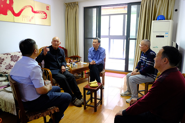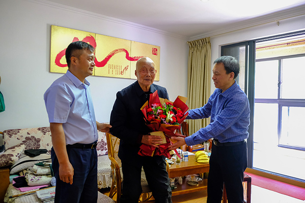 姚赐惠同志1956年被评为安徽省劳模,1983年退休,现年93岁,思维清晰,身体康健。童宏葵一行来到姚老家中,同他亲切握手、交谈,详细询问他的生活起居和身体状况,感谢他曾经为学校建设和发展做出的贡献,向他致以诚挚的问候和美好的祝福,并送上鲜花和慰问品,叮嘱其家人照顾好姚老生活。