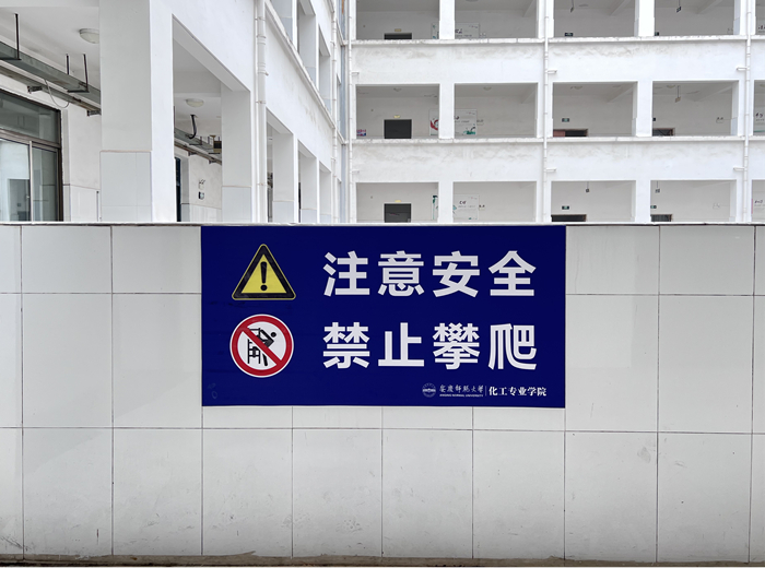教学楼以及室外多处栏杆两侧悬挂“禁止攀爬”警示牌,时刻提醒学生注意安全。