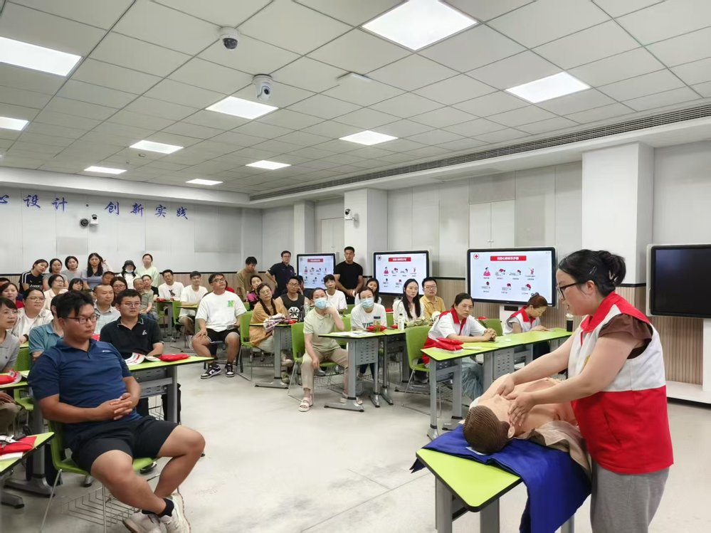 为深入贯彻落实《教育厅等七部门关于加强校园急救能力建设和生命安全保障工作的通知》精神,切实提升校园应急救护能力,后勤保障处联合市红十字会举办我校2025年度第一期应急救护培训班,6月14日,在2号教学楼102教室开展了线下实践操作培训和考核工作,学校医护人员、体育教师、专职辅导员等49人积极参与并完成考核。本次培训采取“线上学习+线下实操”相结合的模式。参训学员此前已通过安庆市红十字会线上学习平台,系统完成视频学习和理论测试,学习内容涵盖急救概论、心肺复苏(CPR)流程、AED操作原理、气道异物梗阻急救(海姆立克法)、创伤救护理论等。线下实操环节中,市红十字会专业讲师以通俗易懂的语言,详细讲解了心肺复苏流程、自动体外除颤器使用及创伤救护技术的规范操作,并指导学员分组进行模拟急救演练,逐一纠正动作细节,确保理论知识有效转化为实际操作能力。最终,全体学员顺利完成市红十字会组织的救护员认证考核。我校高度重视应急救护工作,已申报并立项为全国第三批急救教育试点学校,制定了《校园急救能力建设和生命安全保障工作方案》,持续加强学校急救体系建设,不断提升应急救护水平和生命保障能力,全力守护师生生命健康