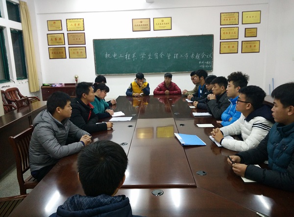 1222下午,机电工程系在一栋教学楼208会议室举行宿舍管理工作专题会议。系分管学生工作负责同志主持会议并讲话,专职辅导员及系学生会宿管部同学参加会议。