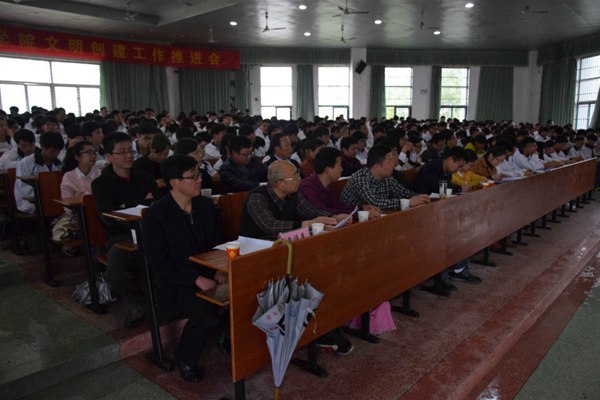 为贯彻落实学院创建省级文明单位活动精神,进一步提升系部文明层次和师生文明素养,加强学生 思想道德教育,树立文明新风。机电工程系于4月20日下午,在图文信息楼报告厅举行了文明创建动员会。系分管学生工作负责同志主持会议,系负责人刘磊出席会议并讲话,系分管教学工作负责同志、各科任课老师、全体辅导员班主任以及14、15级全体学生参加了此次动员会。