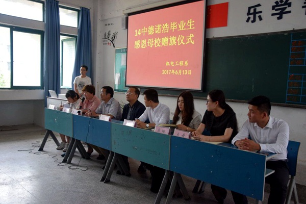 仪式在一栋教学楼204室举行,副院长谭维奇、中德诺浩区域代表刘波一行、机电工程系相关负责人及15、16级中德学子参加了此次赠送仪式。