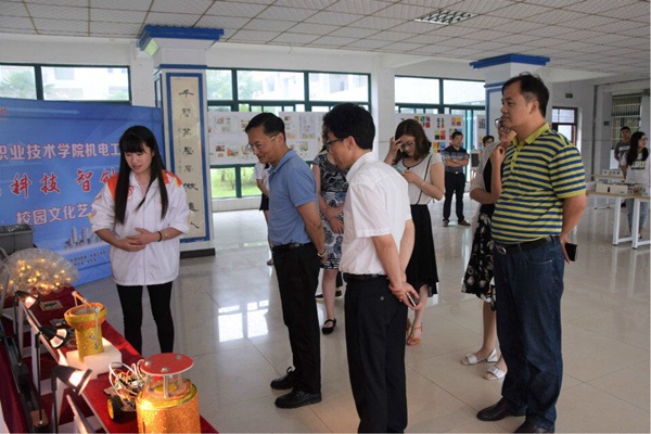 本次科技作品展分为机电控制类、3D打印类、数控加工类、模具成型类和汽车技术类五大类型。现场气氛热烈,科学研讨氛围浓厚,各个项目的制作人向来参观的领导老师、同学热情的介绍着自己的作品。有些制作人在现场展示着自己制作的LED广告灯、交通信号灯、心型跑马灯等,并以他专业的解说水准成功吸引了各位领导的注意,在了解了我们的作品原理后,王进书记给与了同学们高度评价,并表示很满意。