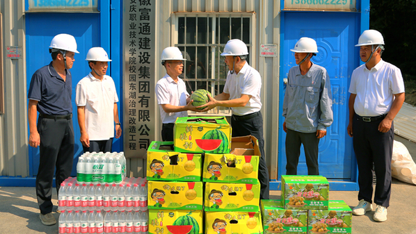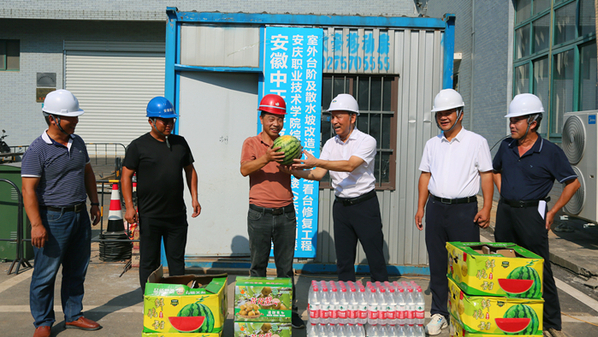 童宏葵一行先后来到多功能会议室、实训楼散水坡、智慧教室改造、东湖清淤、门面房改造、东围墙改造、实训车间改造、体育场主看台和室内体育馆工程的施工现场。童宏葵详细了解项目的工程进度、施工困难等情况,为正在作业的工人们送上西瓜、矿泉水和防暑降温用品,叮嘱他们高温作业,一定要注意防暑,注意安全。
