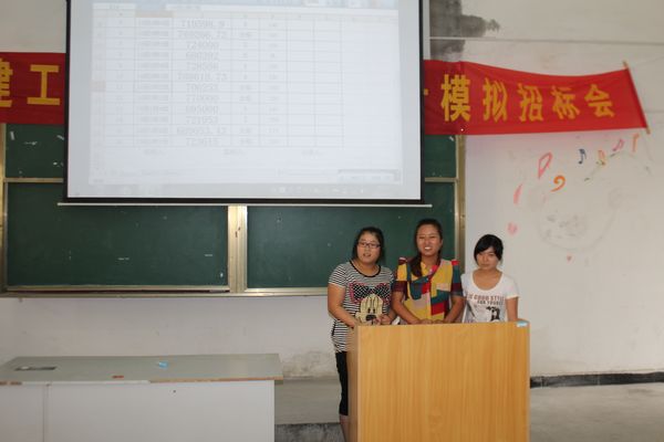 此次开标会的评标专家由安庆市评标专家、行业专家及建工系专业教师5名专家组成。根据各小组的标书内容及现场陈述答辩情况专家们客观、公正的做出了评定,最终评出一等奖1名,二等奖2名,三等奖3名。来自10建工4班的第一投标小组成为本项目的中标小组,由余院长亲自颁发了奖状和奖品。