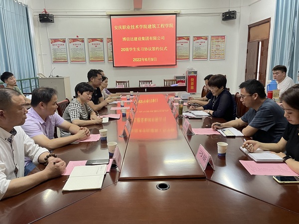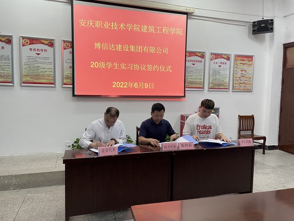 6月9日下午,建筑工程学院与博信达建设集团有限公司关于20级学生实习协议签约仪式隆重举行,博信达建设集团有限公司总经理张羽、建筑工程学院院长陈月萍及校企双方部门负责人出席了仪式,仪式由建筑工程学院党总支副书记叶彤主持,2020级实习学生参加了仪式。