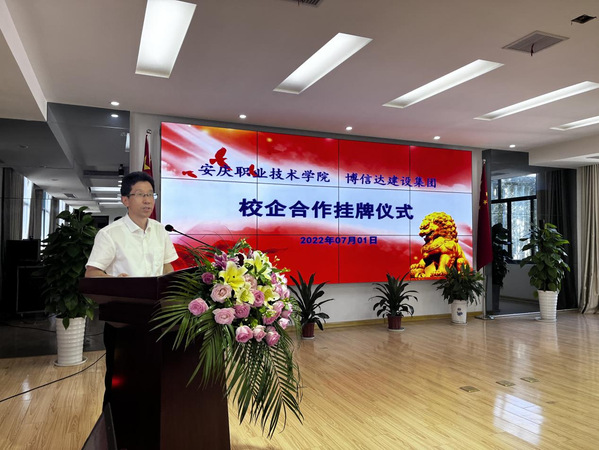 校长毕明生在揭牌仪式上致词,他表示今天是我们中国共产党成立101周年的大喜日子,我们在这个喜庆的日子里举行揭牌标志着我校与博信达集团校企合作 “订单培养”迈上了新台阶。毕明生强调我校作为安庆职教集团龙头单位,时刻牢记市属高校这一基本属性,时刻谨记为企业服务的办学理念,时刻铭记服务地方经济发展的初心使命,通过专业跟着产业走,教师围绕学生转,教学过程与生产过程、课程设置与岗位需求进行对接,从而提高人才培养针对性。当前学校在人才培养上实现了三大突破:一是招生规模大幅增长,今年招生将达到5000人以上;二是本地就业率已经达到40%;三是2021年我校成功入选全国乡村振兴人才培养优质校,同时我校也是国家示范性职业教育集团培育单位。这些为我们校企双方进一步深化合作招生、合作培养、合作就业打下良好基础,下一步校企双方要拓展合作、创新管理,形成“博信达”品牌模式,在全校乃至全省范围建立示范带动效应,积极为我校创建第一批本科专业目标努力奋斗,为安庆挺进百强上台阶作出职业教育应有的贡献。