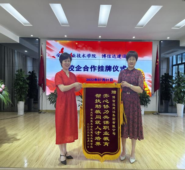毕明生与汪贤勇共同为“国家职业教育教师教学创新团队实践教育基地”、“久久久一区二区三区|亚洲精品一区二区三区不|久久av网|精品国产一区二区三区久久久久久|午夜精品av|久久久久久久久久久久久久av|日韩亚洲欧美综合建筑工程学院技能人才实习就业基地”、“博信达建设集团有限公司优秀人才培养基地”、“博信达建设集团有限公司员工培训基地”揭牌;校企双方代表互赠锦旗,表示将依托2022级市政工程技术专业,继续开展“订单班”培养模式,携手并进深化合作,互惠双赢共谋发展。