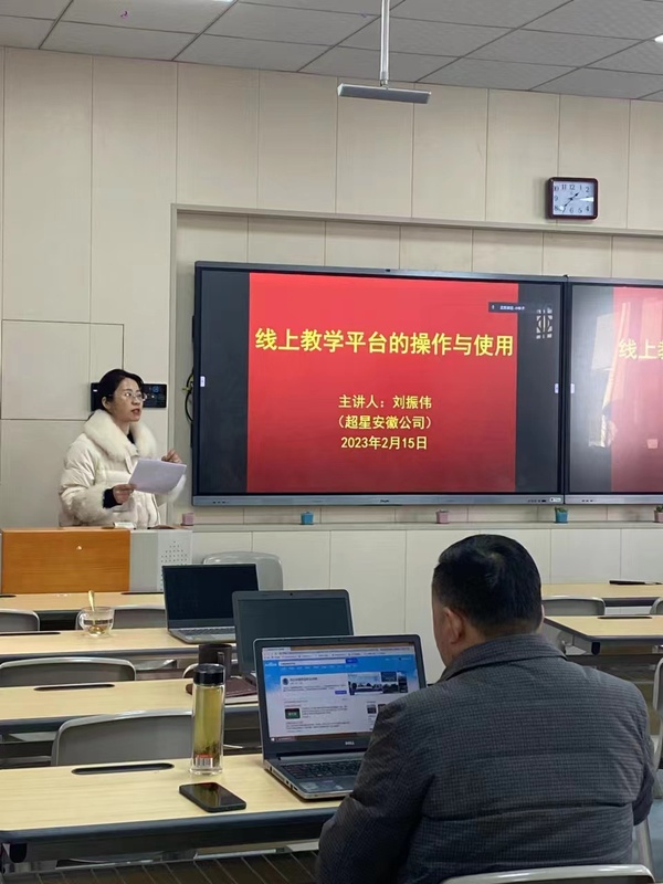2月15日,管理服务学院在3号教学楼308教室开展“一师一优课”线上精品课程建设暨线上教学平台的操作与使用培训会。本次活动采用线上线下相结合形式进行,特邀超新安徽公司刘振伟经理作“线上教学平台的建设与使用”专题讲座,管理服务学院党总支书记、院长陈颖,党总支副书记丁凡,以及全体教职工在308教室现场参加培训,培训会由副院长李敏主持。