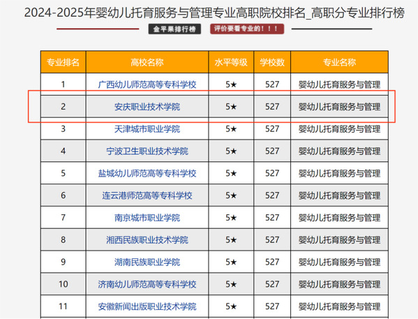 近日,“金平果”高职专业排行榜发布,在高职专业综合竞争力评价数据中,我校婴幼儿托育服务与管理专业取得佳绩,在专业排行榜中位于第二位,受到了评价单位的肯定。