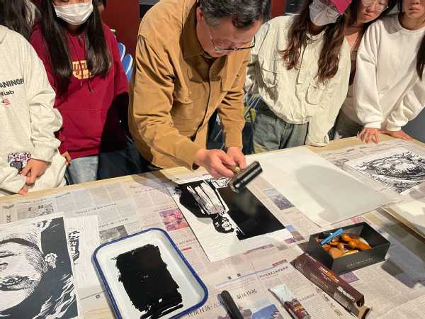 讲座结束后,贾刚老师亲自为同学们示范了版画的制作,也让同学们动手体验如何制作版画,同学们在贾刚老师的带领下积极参与,体验了刻板画的乐趣。