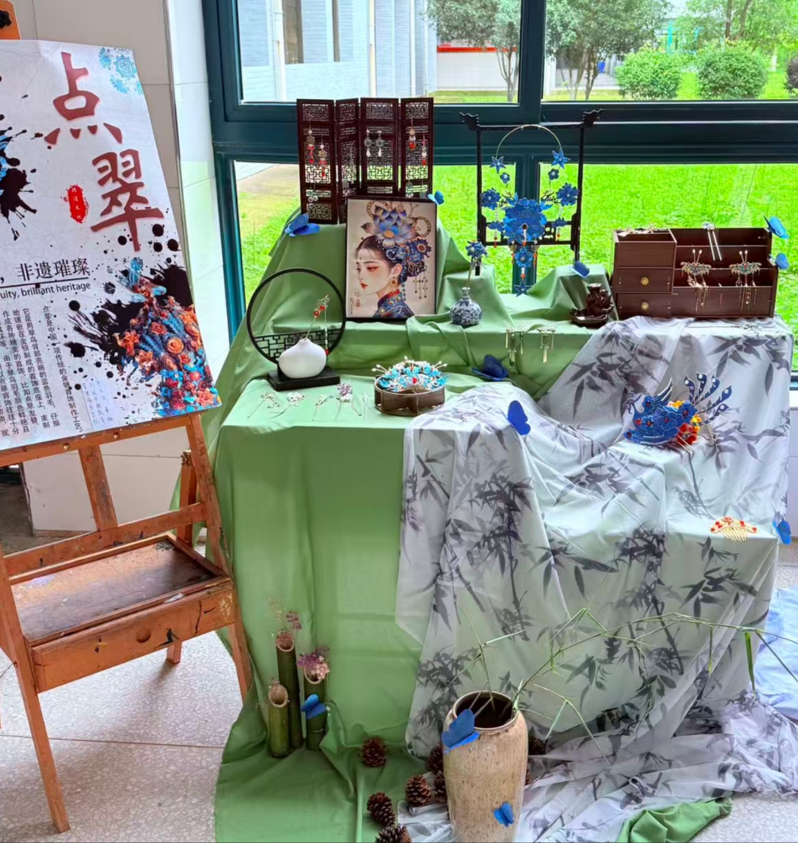 以纸代翠,以心传韵,在复刻与创新中重现古典饰美。发簪簪头缠裹渐变蓝绢,层层叠压出“翠羽”的流光感,搭配珍珠缀成的流苏,步摇间恍若汉代女子鬓边的星辉;凤簪以金属丝为骨,纸艺“点翠”铺就凤凰羽翼,尾端衔着玛瑙红的衍纸花,重现宫廷头饰的雍容;璎珞项链用竹节串联仿翠色琉璃片,竹筒青竹与黛色相映,让传统首饰从“华服配饰”化作可佩戴的文化符号。当仿点翠工艺落于发簪、栖于竹筒,那些曾闪耀在古籍里的“朱颜翠鬓”,正以温柔的现代表达,续写东方美学的璀璨篇章。
