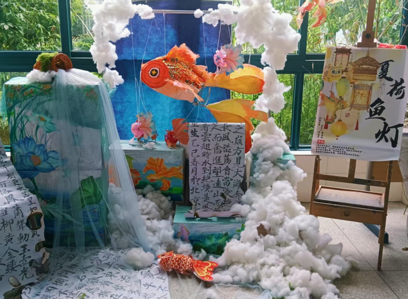 光影揉碎碧波,鱼灯漫溯千年。油画《鱼戏青莲》里,墨色游鱼穿梭于水墨荷叶间,尾鳍摆动似要搅碎满池涟漪;旁侧书法卷轴题写“鱼跃龙门”,笔锋起落间晕染江南文气。纱幔自顶部垂落如银瀑,棉絮云朵悬于半空,其间点缀手工竹制鱼灯——红鲤灯嘴衔流苏轻晃,青鱼灯腹透暖光,光影漫过纱幔,在地面投下“鱼影浮动”的动态画稿。当观者穿行其间,恍若踏入“灯影照水、云絮沾衣”的立体诗卷,传统鱼灯的烟火气与江南水墨的朦胧感在此交融,构筑起可触摸的“幻境江南”。