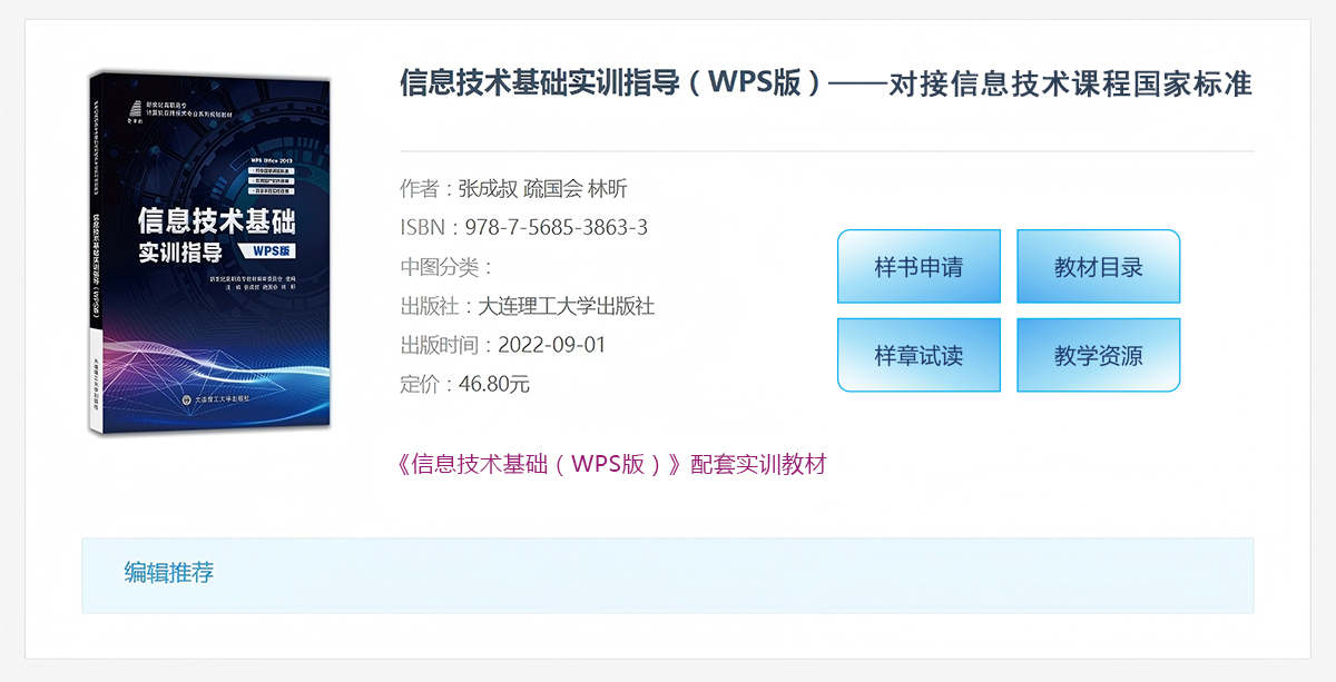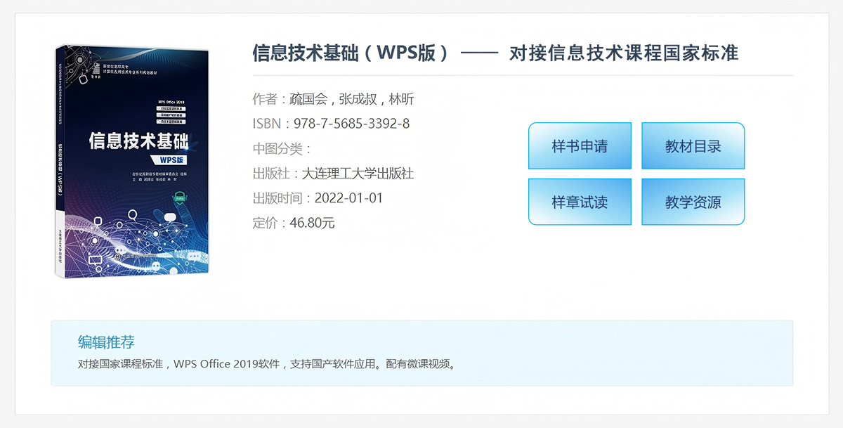 采用WPS Office 2019软件进行编写,大力推广国产软件在高等职业教育和青年群体中的应用,是服务国家信息安全战略的重要举措,符合新时代对高等职业教育专科公共基础课“信息技术”课程建设的要求。