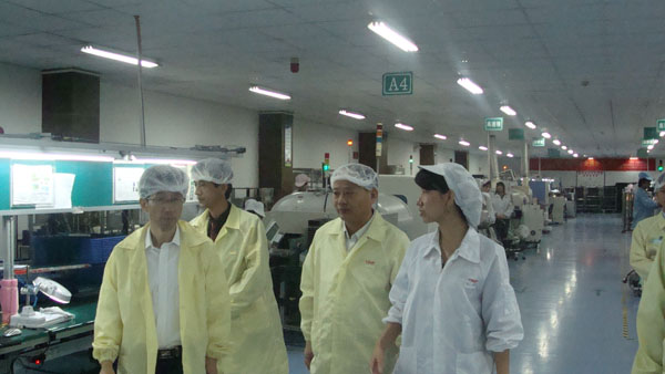 6月17日上午,毕院长一行在郭经理的陪同下,参观了几家比较有名的企业:大鹏电子有限公司、峻凌电子有限公司、辅讯光电工业有限公司。各企业人事主管向毕院长一行介绍了企业生产情况、企业文化、职工薪资、保险、住宿、伙食、旅游、学历发展等情况,毕院长还在人事主管的陪同下,参观了企业的生产车间、食堂等。