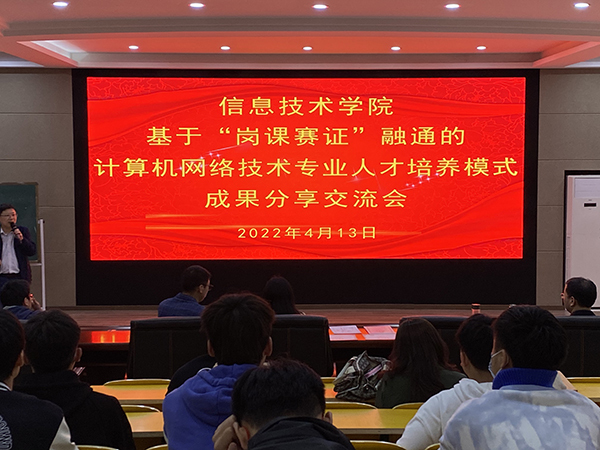 4月13日下午,信息技术学院在2号教学楼216阶梯教室举行基于“岗课赛证”融通的计算机网络技术专业成果分享交流会,副院长熊祖涛副教授、迅腾科技集团项目总监陈刚出席交流会,计算机网络技术专业教学团队全体教师及80多名学生代表参加,会议由计算机网络技术专业建设负责人陈富汉副教授主持。