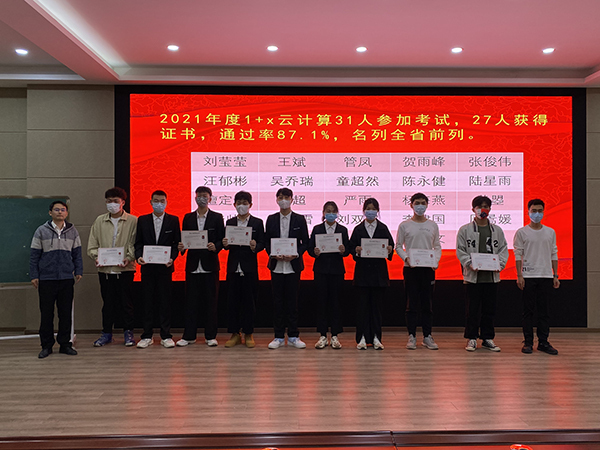 会议公布了学生参与“1+X”证书考试的获证情况。2020年度云计算平台与运维“1+X”证书50人参加考试,39人获得了证书,通过率78%;2021年31人参加考试,27人通过,通过率87.1%;大数据平台运维“1+X”职业技能等级证书50人参加,33人获得证书,通过率66%。培训教师为获证学生颁发了“1+X”证书。