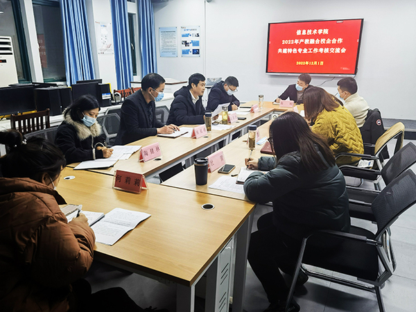 为全面评价学院校企合作办学情况,更好地推进校企合作办学专业发展,12月1日下午,信息技术学院组织开展了2022年产教融合校企合作共建特色专业工作考核交流会。天津迅腾科技集团驻校负责人陈刚、安徽辰夫科技驻校负责人何莉莉、学院管理人员参加了会议,会议由信息技术学院党总支书记、院长疏国会教授主持。