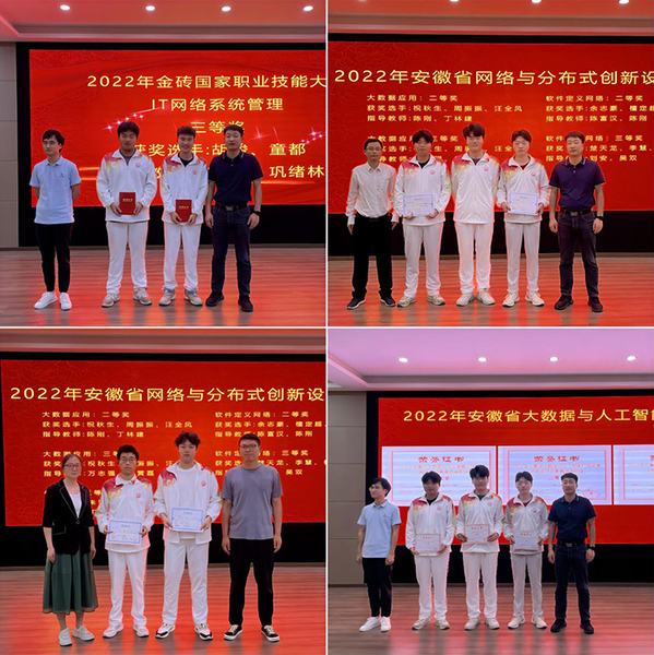 在过去的一学年中,网络团队组织学生参加了金砖国家职业技能大赛IT网络系统管理赛项、安徽省职业技能大赛云计算赛项、安徽省大学生网络与分布式系统创新设计大赛、安徽省大数据与人工智能应用竞赛四项省级以上赛事。共有35名学生在竞技场上获奖,为校争光,其中1名学生获省赛一等奖,9名学生获省赛二等奖;同时,因对安徽省大学生网络与分布式系统创新设计大赛组织有力,学校获得由省教育厅、省电子学会及省计算机学会颁发的“优秀组织单位”荣誉称号。