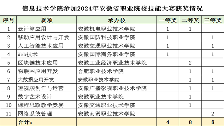 1月17日,随着“移动应用设计与开发”赛项和课程思政教学比赛的结束,我校信息技术学院参加的2024年安徽省职业院校技能大赛(高职组)电子信息大类各赛项已全部落幕。从赛后公布的成绩获悉,信息技术学院在本次大赛中表现突出,取得一等奖4项、二等奖8项、三等奖8项的优异成绩,在获奖等级与数量上再一次取得突破性成果。