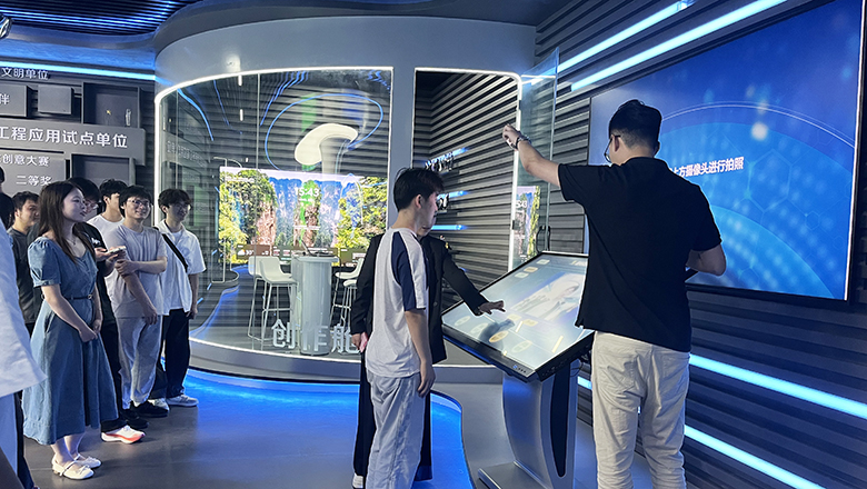 在星际数科工作人员的带领下,师生们依次参观了剪辑工作室、短剧剧本创作室、后期制作区、AIGC和虚拟现实体验区等核心部门。公司先进的设备和专业化的工作流程让学生们了解技术前沿,尤其在技术展示区,专业人员现场演示了剪辑软件的操作技巧,并重点讲解了AI技术在短剧创作中的创新应用,引发了学生们的浓厚兴趣。
