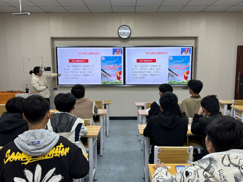 马克思主义学院利用思政课课内教学、课外实践环节,培养学生弘扬宪法精神、维护宪法权威的素养能力。在课内教学过程中,学生通过《思想道德与法治》课程法治思想知识,学习“国家宪法日”的由来、我国宪法的形成和修改过程等内容。在课外实践中,学生进入行知广场,进行了庄严的宪法宣誓仪式,从而树立宪法意识,维护宪法权威,恪守宪法原则,弘扬宪法精神。参与活动的学生在浓厚的宪法学习中受到熏陶、感染,增强了宪法意识。通过活动,学生在充分了解宪法精神的基础上,深入了解宪法、尊崇宪法,增强法治意识。