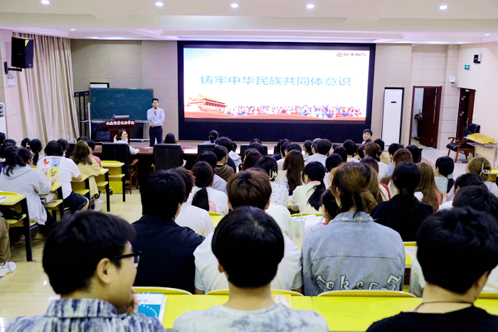 为深入学习习近平总书记关于铸牢中华民族共同体意识的重要论述,教育引导广大师生深入理解和践行铸牢中华民族共同体意识,4月22日晚上,校长毕明生教授以“坚定文化自信 构筑中华民族共有精神家园”为题给师生讲授“铸牢中华民族共同体意识”专题讲座。马克思主义学院院长余锋主持讲座,教师代表及各学院学生代表聆听讲座。