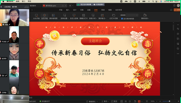 为进一步加强寒假期间学生思想政治教育工作,积极营造温馨和谐、安全文明的节日氛围,做到学生管理工作“不断线”,我校开展“传承新春习俗、弘扬文化自信”主题班会活动,各班级利用腾讯会议、钉钉、超星系统等网络平台,在春节前召开了一次形式多样、内容丰富的线上“云”班会,家校联动积极开展传统文化教育。
