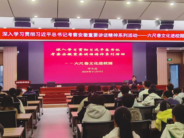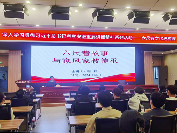 为进一步深入学习贯彻习近平总书记考察安徽重要讲话精神,11月6日下午,我校在图文信息中心三楼报告厅举办六尺巷文化进校园专题报告会,报告会邀请了桐城市文昌街道六尺巷社区党总支书记、居委会主任张耘主讲。校党委委员、统战部部长李五一,机关党总支第六党支部党员教师、全体专职辅导员、思政课教师代表和学生干部代表共120余人参加报告会。